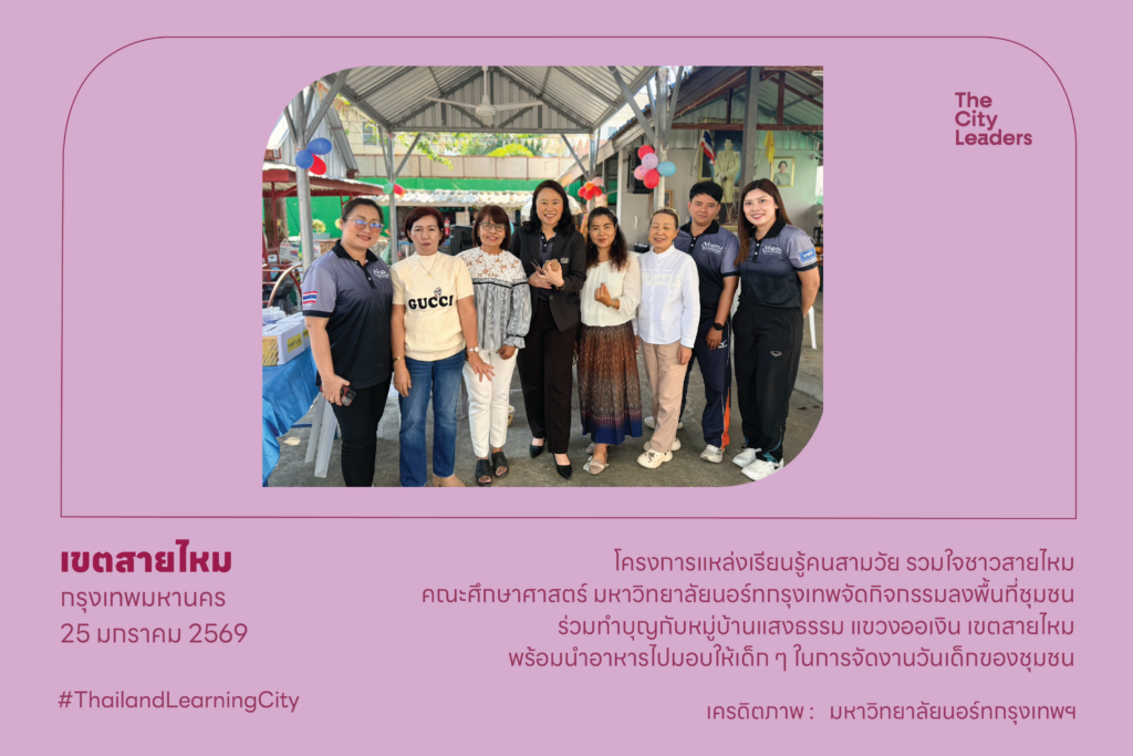 25 มกราคม 2569 โครงการแหล่งเรียนรู้คนสามวัย รวมใจชาวสายไหม คณะศึกษาศาสตร์ มหาวิทยาลัยนอร์ทกรุงเทพจัดกิจกรรมลงพื้นที่ชุมชน ร่วมทำบุญกับหมู่บ้านแสงธรรม แขวงออเงิน เขตสายไหม พร้อมนำอาหารไปมอบให้เด็ก ๆ ในการจัดงานวันเด็กของชุมชน บูรณาการงานด้านการวิจัย และด้านการบริการวิชาการแก่สังคม สะท้อนบทบาทของคณะและมหาวิทยาลัยในการมีส่วนร่วมพัฒนาชุมชนอย่างยั่งยืน