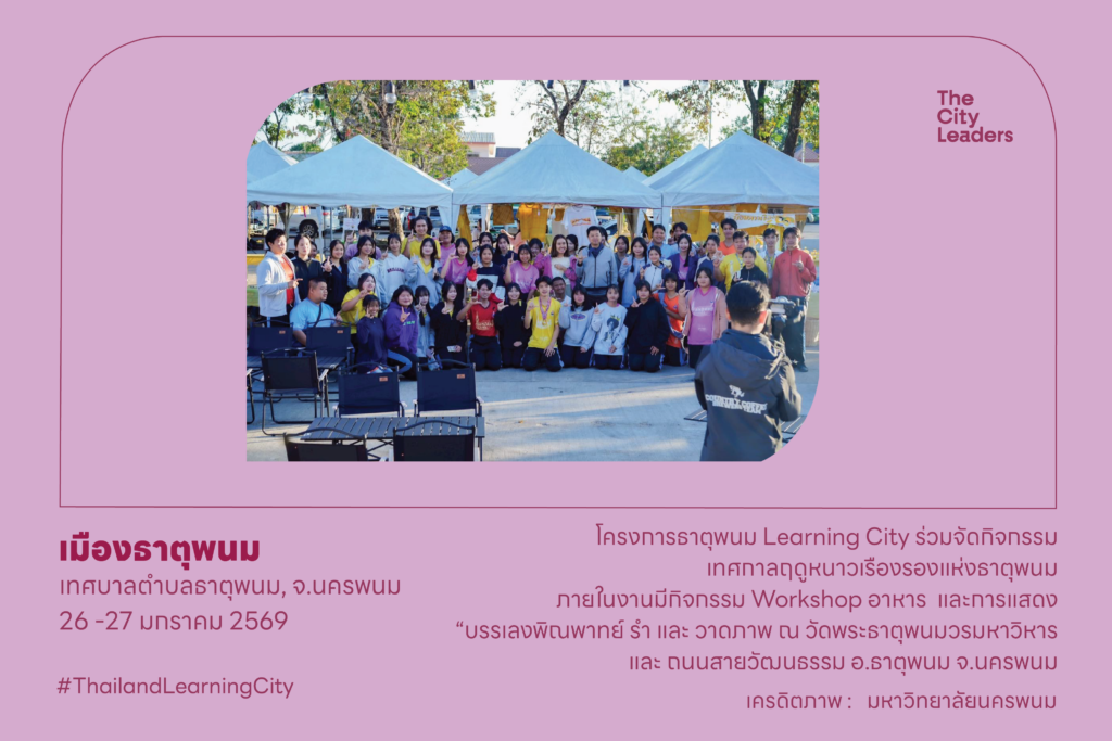 26-27 มกราคม 2569 โครงการธาตุพนม Learning City ร่วมจัดกิจกรรมเทศกาลฤดูหนาวเรืองรองแห่งธาตุพนม ภายในงานมีกิจกรรม Workshop งานศิลปะโครงการวิจัย Workshop การอาหาร และการแสดง“บรรเลงพิณพาทย์ รำ และ วาดภาพ ณ วัดพระธาตุพนมวรมหาวิหาร และ ถนนสายวัฒนธรรม อำเภอธาตุพนม จังหวัดนครพนม
