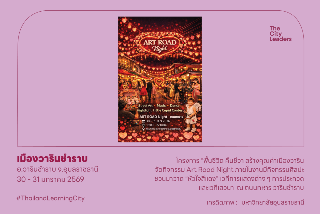 30 – 31 มกราคม 2569 โครงการ “ฟื้นชีวิต คืนชีวา สร้างคุณค่าเมืองวาริน จัดกิจกรรม Art Road Night ภายในงานมีกิจกรรมศิลปะ ชวนมาวาด “หัวใจสีแดง” เวทีการแสดงต่าง ๆ การประกวด และเวทีเสวนา ณ ถนนทหาร วารินชำราบ