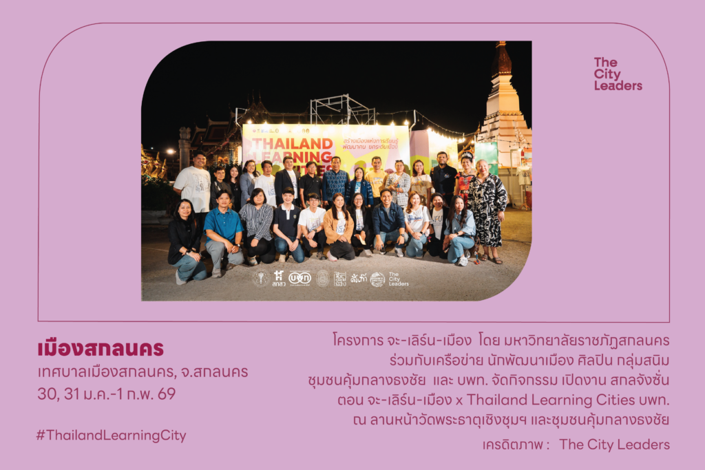 30 มกราคม 2569 โครงการ จะ-เลิร์น-เมือง (Learning City เมืองสกลนคร) โดย มหาวิทยาลัยราชภัฏสกลนคร ร่วมกับเครือข่าย นักพัฒนาเมือง ศิลปิน กลุ่มสนิม ชุมชนคุ้มกลางธงชัย และ บพท. จัดกิจกรรม เปิดงาน สกลจังซั่น ตอน จะ-เลิร์น-เมือง x Thailand Learning Cities บพท. ณ ลานหน้าวัดพระธาตุเชิงชุมฯ และชุมชนคุ้มกลางธงชัย